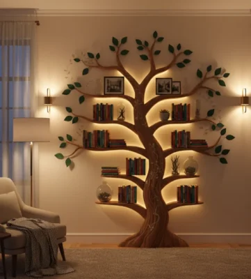 Good lighting can make your tree bookcase look even more stunning especially in the evening. Whether you want to create a cozy vibe or simply draw attention to the shelf’s unique shape, the right lighting setup can take it to the next level.